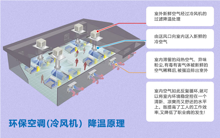 在空氣不流通的環境中,尤其是化工車間,容易產生建筑綜合癥,如悶熱、頭疼、眩暈、過敏、咳嗽等不適癥狀。使用環保空調(冷風機)通風降溫方案即可以有效降溫,又能保證空氣流通